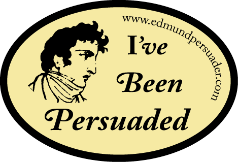 A reader once suggested we print a button, not too large, to be worn discreetly by readers of Edmund Persuader. She had a very particular notion of what the motto should be, and as you can see from the photograph, her idea was irresistible. Someday it will be executed in cloisonné, perhaps, or as a cameo. But for now it’s just a button with a pin, though not at all common. We went one better by making a bumper sticker as well; for a peek, scroll to the bottom of this page. If you have a slow connection, be patient, as the images may take a minute to appear.
